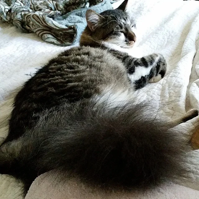 Nap time. Her tail just slays me (it is as long as the rest of her body, and the prettiest I've ever seen). Everything about her is so soft & comfy...except her personality. In typical Maine Coon style, she is not a buddy & she will decide when & how close she will allow you to get to her. However, at nap time...she snuggles. Lady Galadriel, crazy kitty!