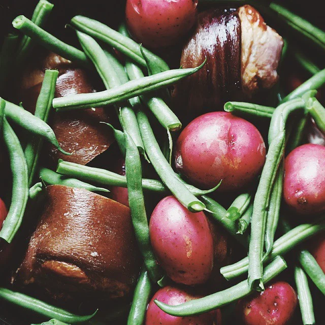 Been having some "homesick" pangs lately. Which is so odd because Tucson is my home...but it is my theory that, when you are born and bred in the South, there is always a little piece of your heart that longs to be there. This Texas girl is fighting with those feelings (missing a few sets of grandparents lately). Today I figured I would soothe the "sickness" in the best way possible, with some southern food (soul food of a different kind from last night's). A photo {from above} of today's dinner in the slow cooker: Ham hocks, fresh snapped green beans and red potatoes. I will also be making some sweet tea here soon.
