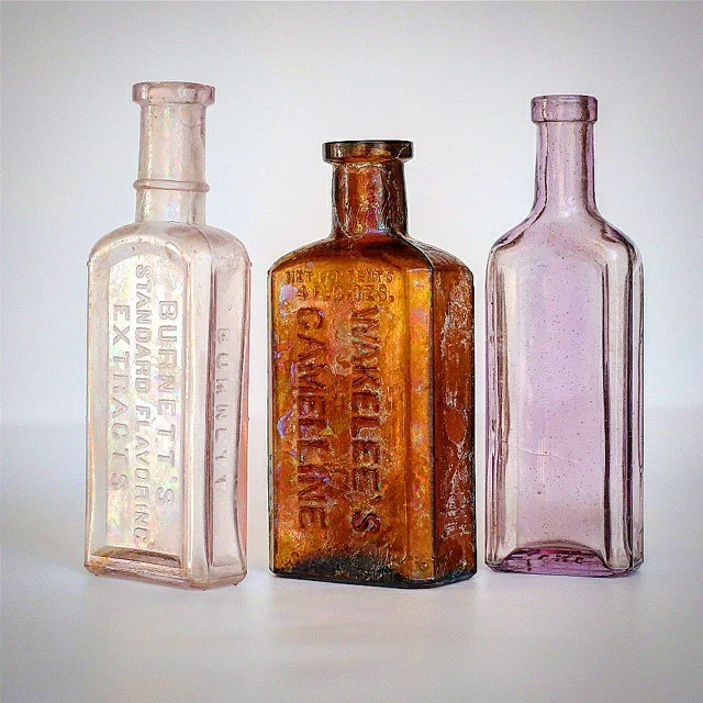 These bottles were all dug up and we're all made in the late 1800s. The Burnett bottle (left) held some sort of flavoring and the Wakelee's bottle (middle) was a beauty serum. They all have a beautiful opalescent shimmer created from the chemical reaction of the dirt and the magnesium in the glass.