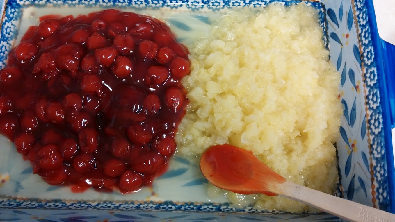 Dump cherry pie filling and crushed pineapple into baking dish. Stir together.