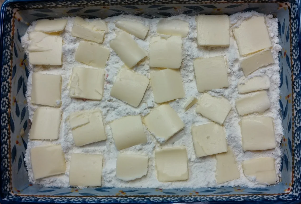 Sprinkle cake mix over the top of the fruit. Slice butter and distribute over the surface of the cake mix.