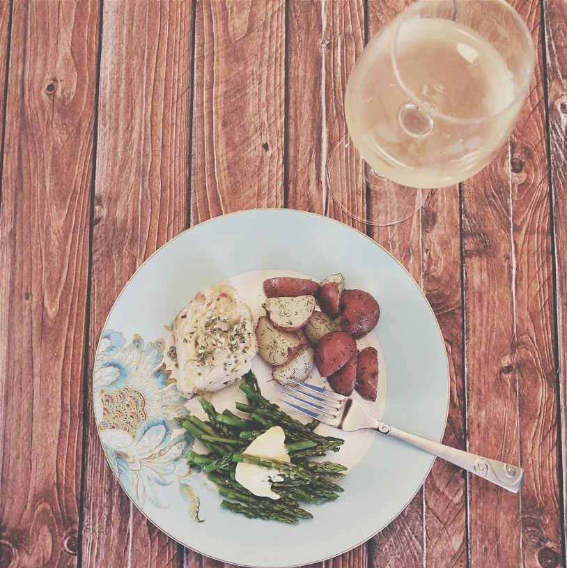 Baked Chicken, Red Potatoes with Dill, Steamed Asparagus (and Dump Cake for Dessert)