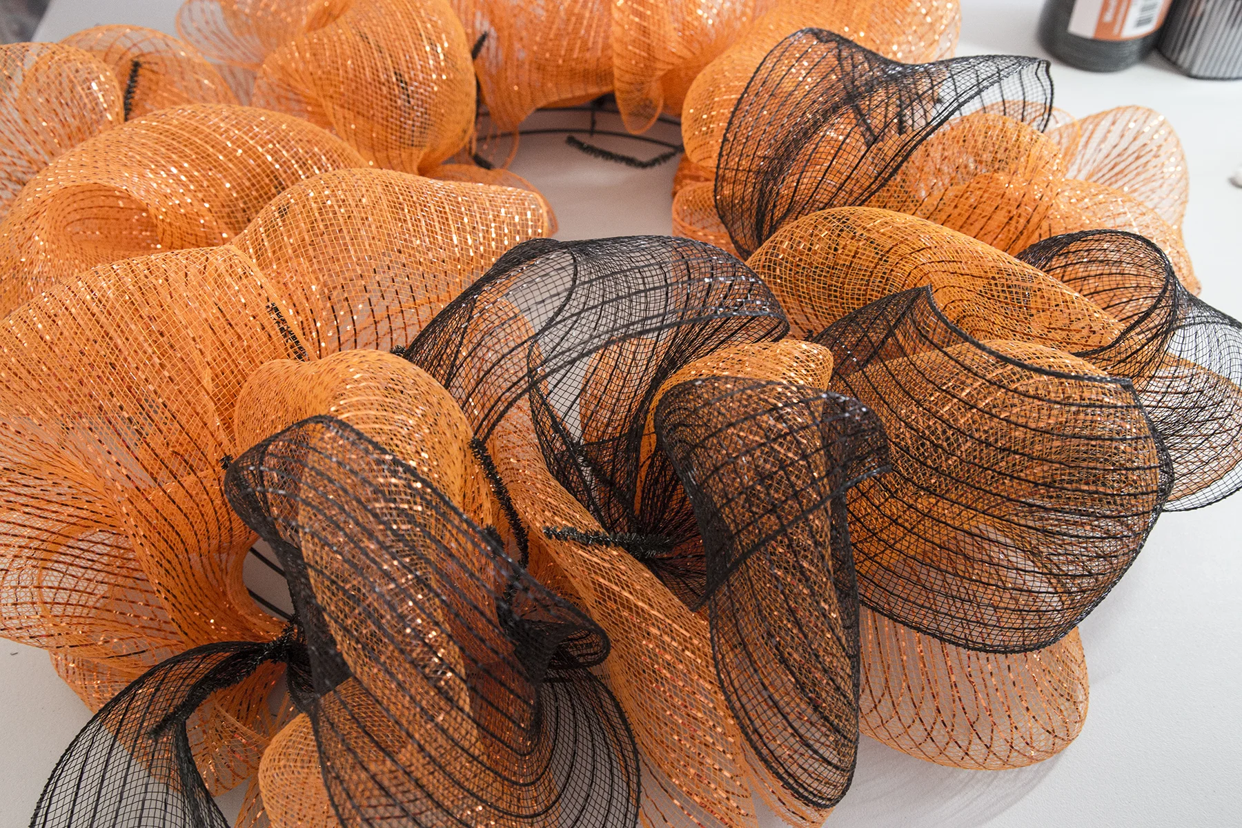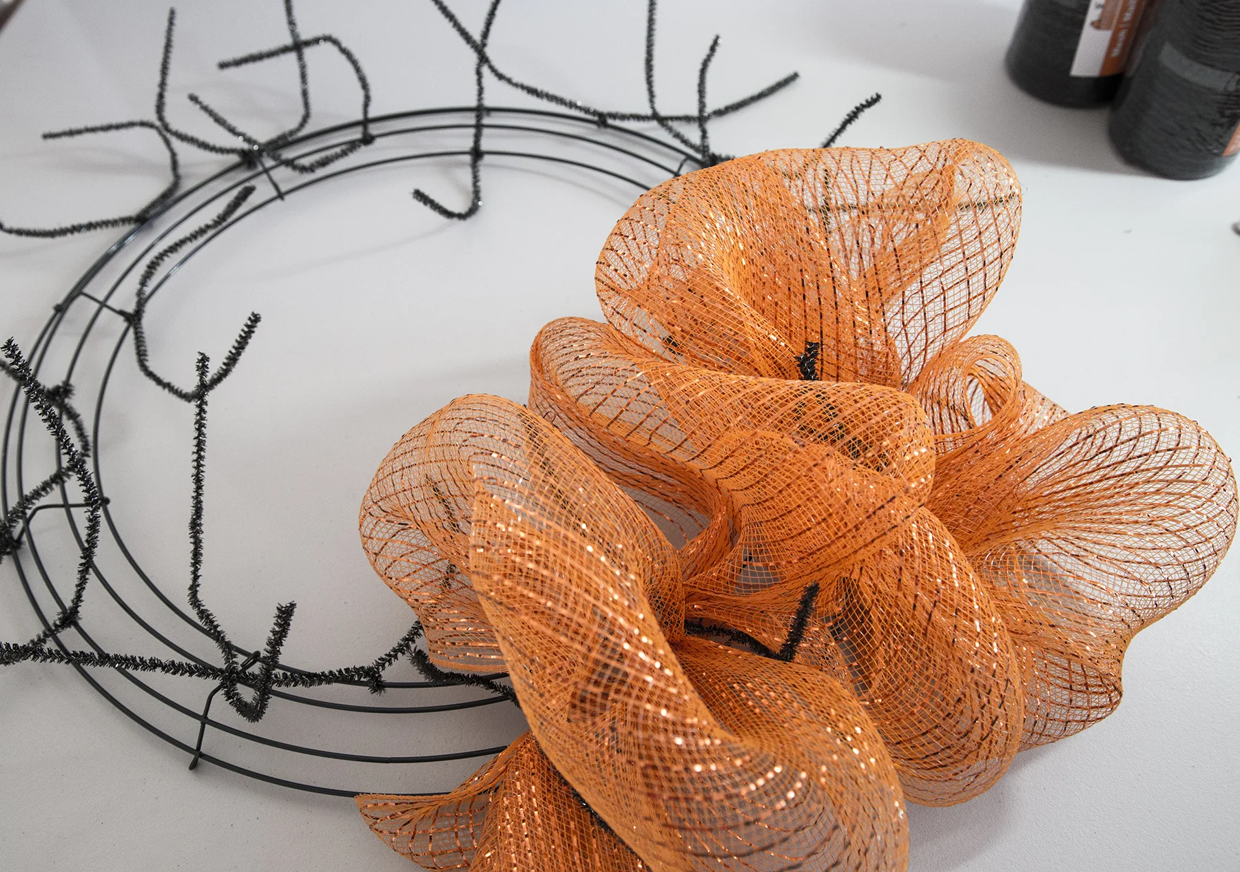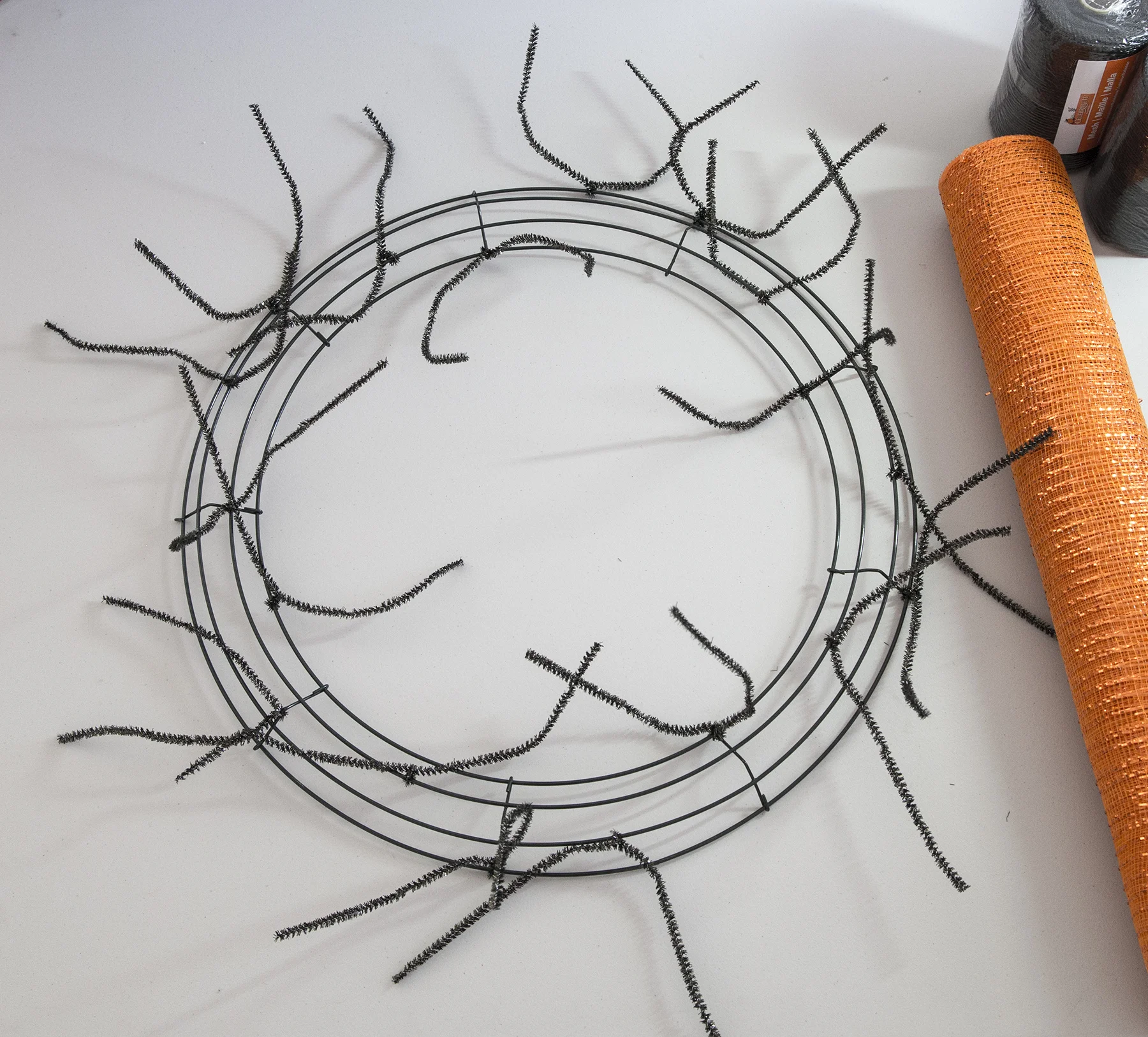 To start, you pick a place on the wreath and begin by sticking the end of your mesh on the center of your chenille stem and twisting the stem around the mesh to hold it firmly in place (think of a bread twist tie and twist it 2-3 times). Then leave about 10” of mesh before you secure to the next twisty. Make certain to go ‘high’ then ‘low’ on your spacing so that it looks even as you go around. Once you start, you will get a feel for the right amount of mesh and spacing. Sometimes I go around the wreath form twice, and sometimes only once (like here, as I knew I was going to use the smaller black mesh over the orange, and then use ribbon as well). Leave the tails of your stems/twisties long as you will be using them for other mesh or ribbon as you choose.