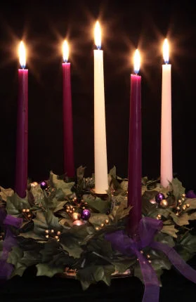 The Advent wreath, or Advent crown, is a Christian tradition that symbolizes the passage of the four weeks of Advent in the liturgical calendar of the Western church. It is usually a horizontal evergreen wreath with four candles and often, a fifth, white candle in the center. Beginning with the First Sunday of Advent, the lighting of a candle can be accompanied by a Bible reading and prayers. An additional candle is lit during each subsequent week until, by the last Sunday before Christmas, all four candles are lit. Many Advent wreaths include a fifth, Christ candle which is lit at Christmas Eve or Christmas Day. (Source: Wikipedia)